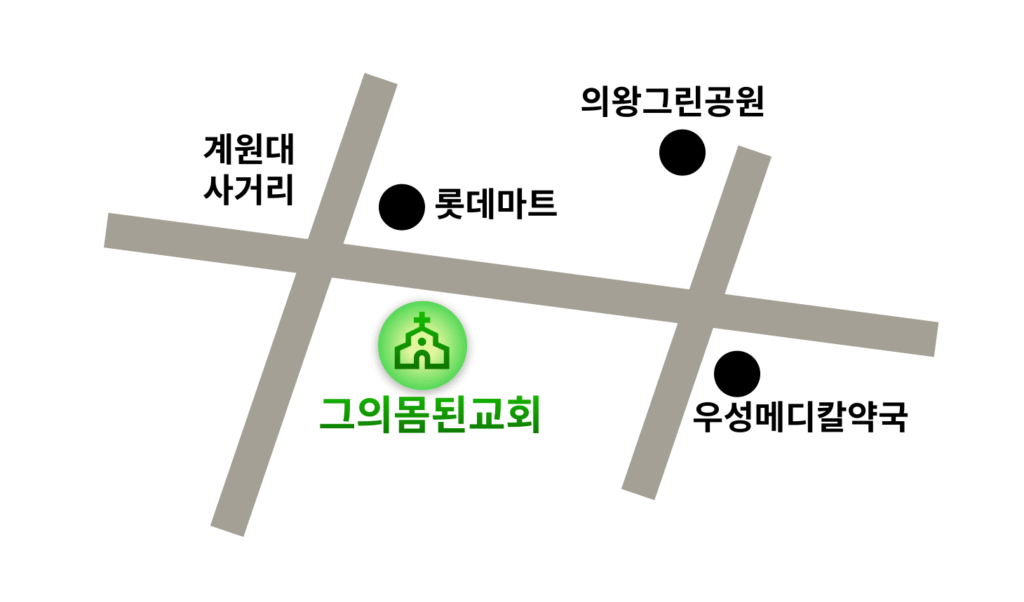 *PC로 접속을 권장합니다 (모바일로 접속 시 가로 화면 권장) 복음만이 당신에게 허락된 유일한 기쁨입니다 그의몸된교회는 대한예수교장로회 합신교단 소속의 지역교회로서사람을 살리며 지역사회를 섬기는 교회입니다. 주소 경기도 의왕시 계원대학로 12 롯데프라자 601호 (내손동, 성호빌딩)유튜브 그의몸된교회 오시는 길 경기도 의왕시 계원대학로 12 롯데프라자 601호 (내손동, 성호빌딩) 계원대학 쪽으로 우회전 후 첫 번째 블록 중간에 있는롯데프라자 601호에 있습니다.건너편에 롯데마트가 있으며 1층에 우리할매떡볶이 가게가 있는건물입니다.